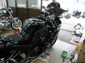 リンクを交換した事によりヘッドライトの光軸が上がってしまうので、調整します。テスターで計測するとかなり上に向いているので、基準の範囲に入るように調整をします。トシ君の安定感あるまたがりでズムーズに調整終了。